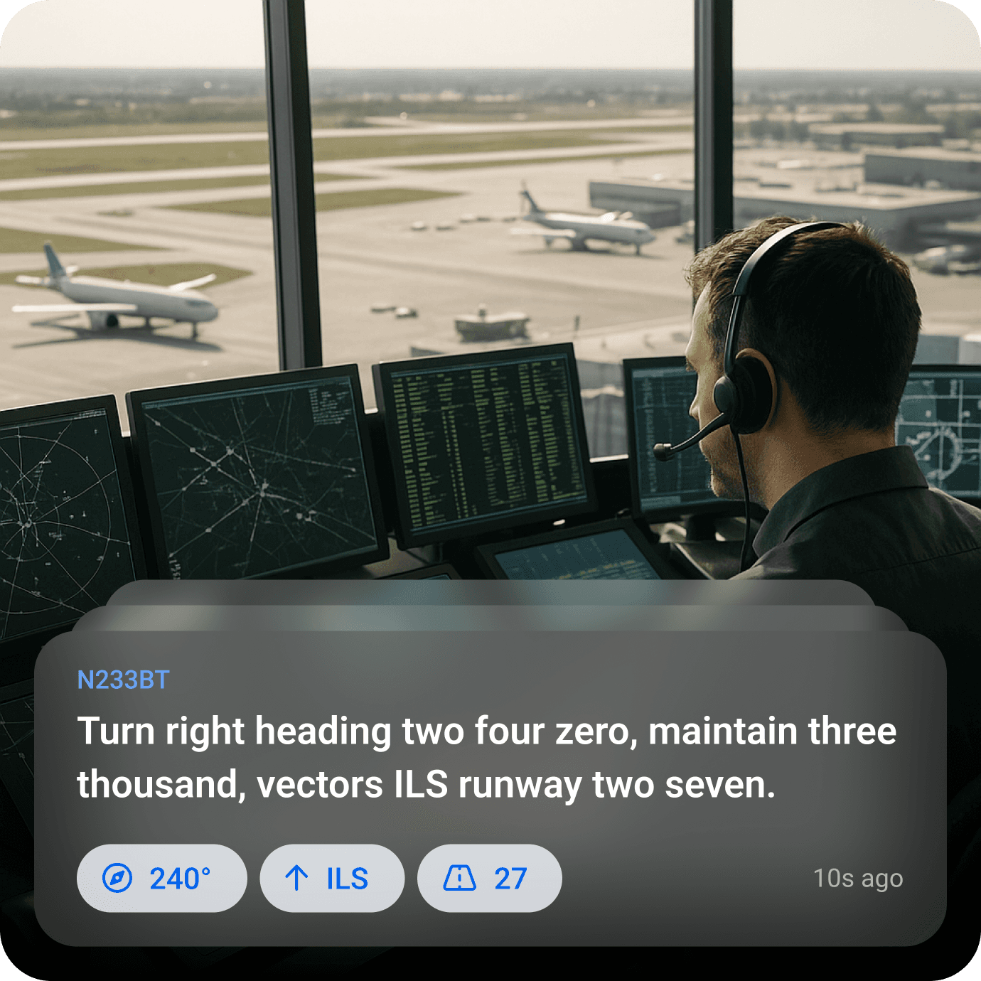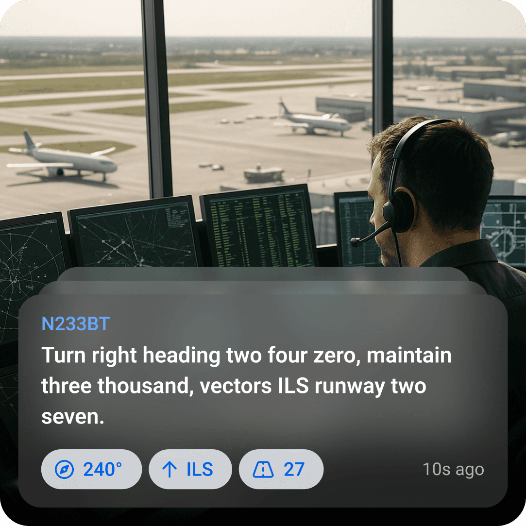 Instantly converts ATC audio into clear text, fully offline and optimized for aviation phraseology. Reduces missed calls and cognitive load in high-workload moments.