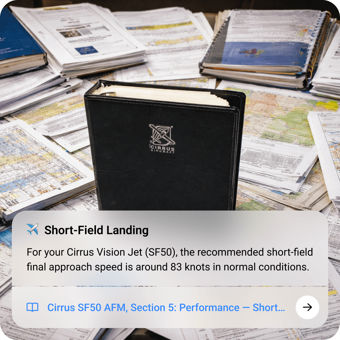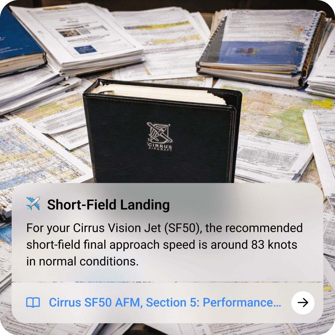 Uses official POHs, aircraft manuals, and regulatory documentation to deliver precise, sourced answers tailored to aviation use.